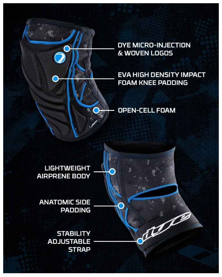 The lightweight airprene body provides a comfortable fit with ample circulation and ventilation. The back section of the knee pad has also been opened up to allow more venting, flexibility and a more comfortable fit. DYE MICRO INJECTION LOGOS Micro injection logos complete the design in typical DYE fashion. NEW ADJUSTABLE STRAP The new adjustable lower leg strap allows you to tighten the knee pad to your liking and helps to prevent the pad from sliding down. EVA HIGH DENSITY FOAM KNEE PADDING This EVA high density foam knee wraps around your knee for a more custom fit and offers more cushioning for direct impacts. OPEN-CELL FOAM High impact open-cell foam is extremely impact resistant and offers you a very high level of protection. NEW SIDE PADDING Padding has been specifically added to the sides of the knee pads. These individual pads help when sliding or crawling at different angles.