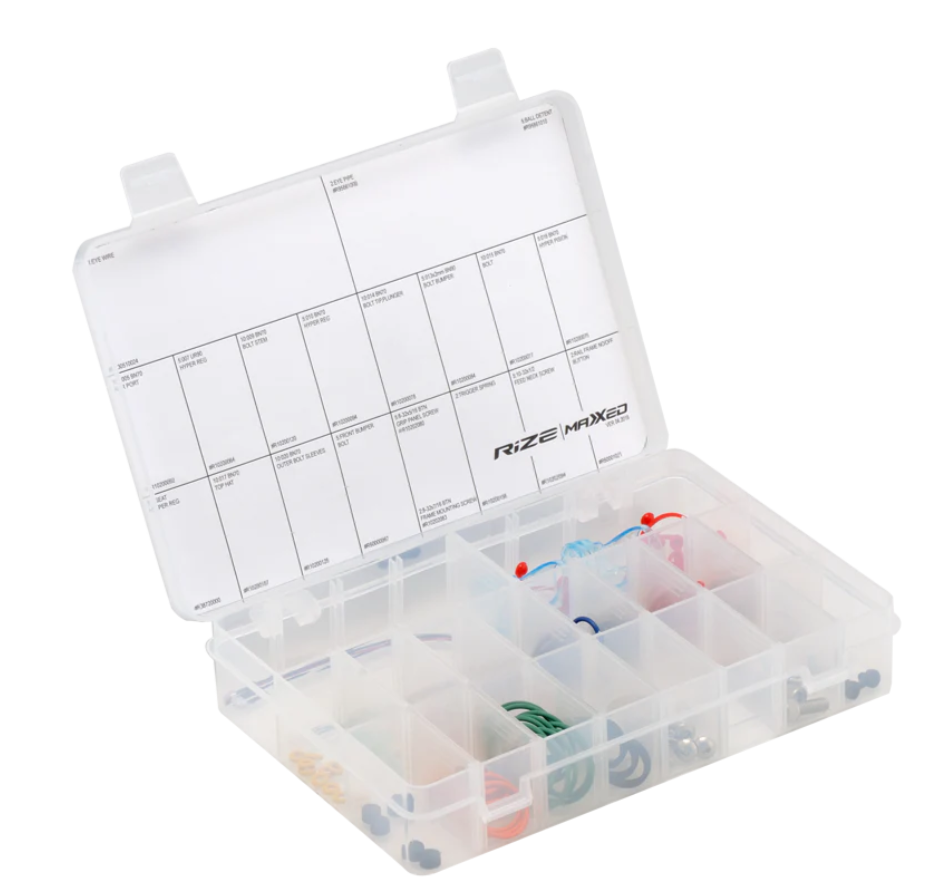 The Rize/MaXXed Medium size repair kit is the must have for basic backup parts. This kit includes O-rings, screws, eye pipes, eye wire, springs, and more. Make sure you never go to the field without one in your Dye gear bag!