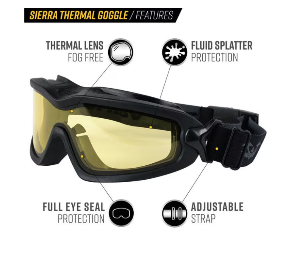The Valken Sierra Thermal Goggles are a low profile, thermal lens goggle that is very resistant to cold and heat. These tactical goggles provide excellent resistance to fogging caused by temperature differences between indoor and outdoor, or between on-site and ambient environment. The Sierra airsoft goggles are perfect to be used as airsoft eye protection. The scratch resistant polycarbonate lens also provides 99.9% UVA/B/C protection, and the soft TPU goggle body conforms to facial contours to provide a full rubber eye seal. The Valken Sierra airsoft goggle features a special ventilation system with 14 indirect vents located at the top and bottom of the frame to allow air flow and heat release. We also recommend using these goggles in combination with either the Valken Kilo Mesh Mask, or the Valken Tango Mesh Mask for overall safety and protection.