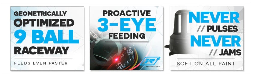 Intelligent Proactive 3-Eye Feeding: 3-eye feeding technology continuously monitors the paint in your loader. Two eyes monitor the ball stack, while one eye tracks the gap in between the stack across the entire feeding cycle, ensuring your marker never misses a beat.