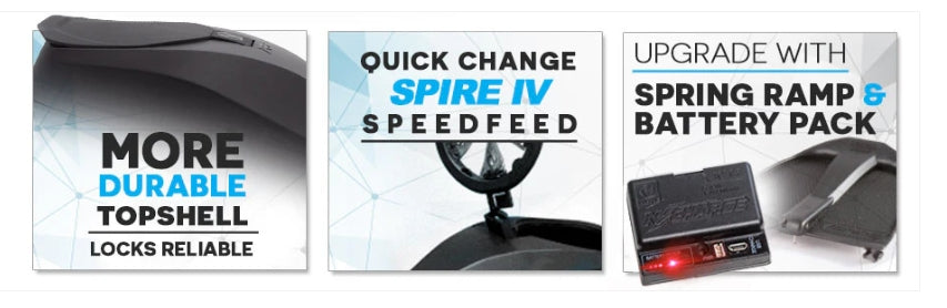 The Spire IR² is paintball's best value to performance loader. Our third generation is soft on paint, with a 9-ball raceway to feed high rates of fire without ever jamming. Upgraded interlocking shell design holds together. Featuring a quick change toolless lid. 2-piece toolless shell for easy disassembly, cleaning, and battery changing. Upgraded toolless and more durable dual material Spire drive allows for easy cleaning of the ball raceway.